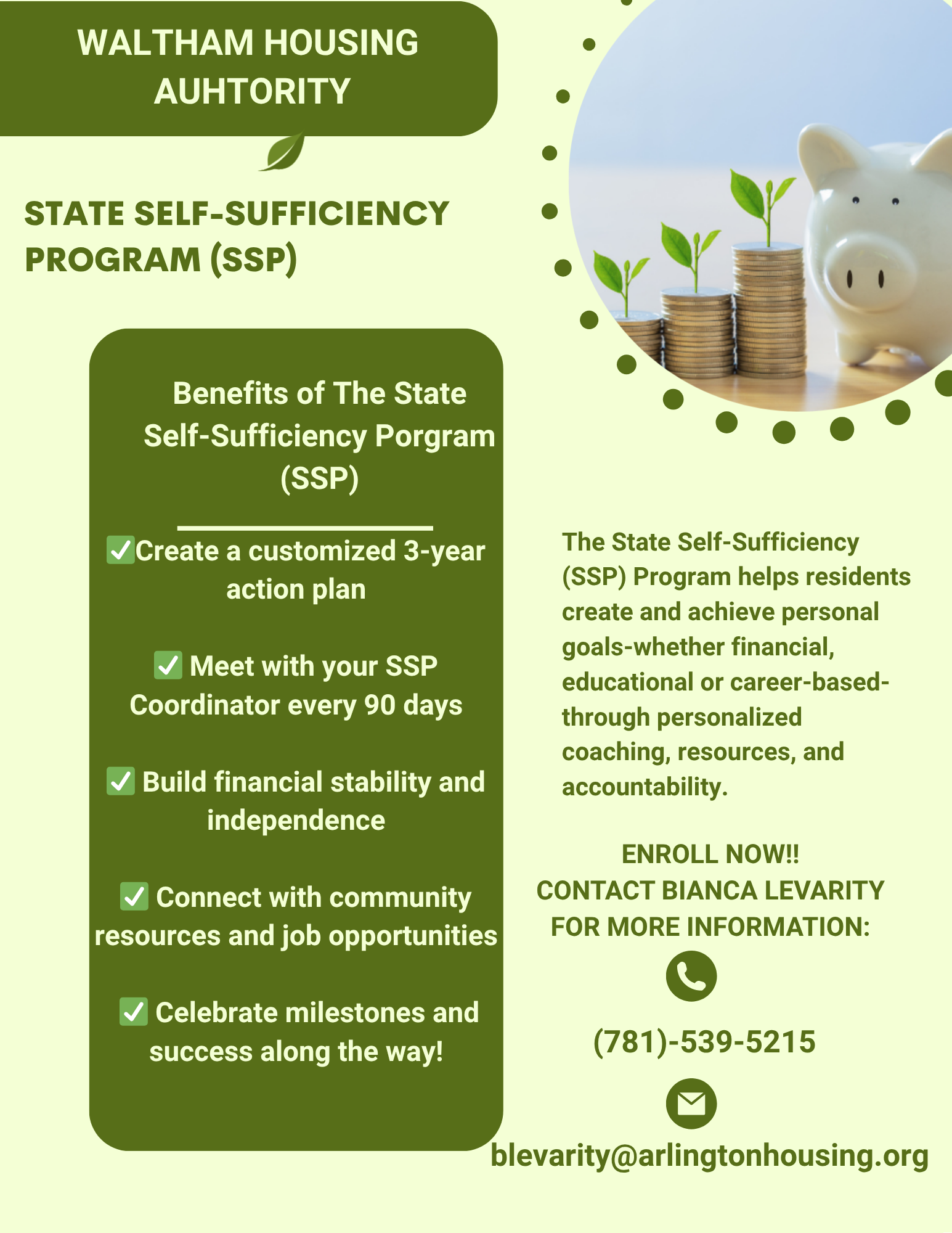 When you enroll, you will work with your State Self-Sufficiency Program Coordinator (SSP) to set personal goals you’d like to achieve during the program. Every 90 days, you’ll meet with your coordinator to review your progress, stay accountable, and receive guidance and support.